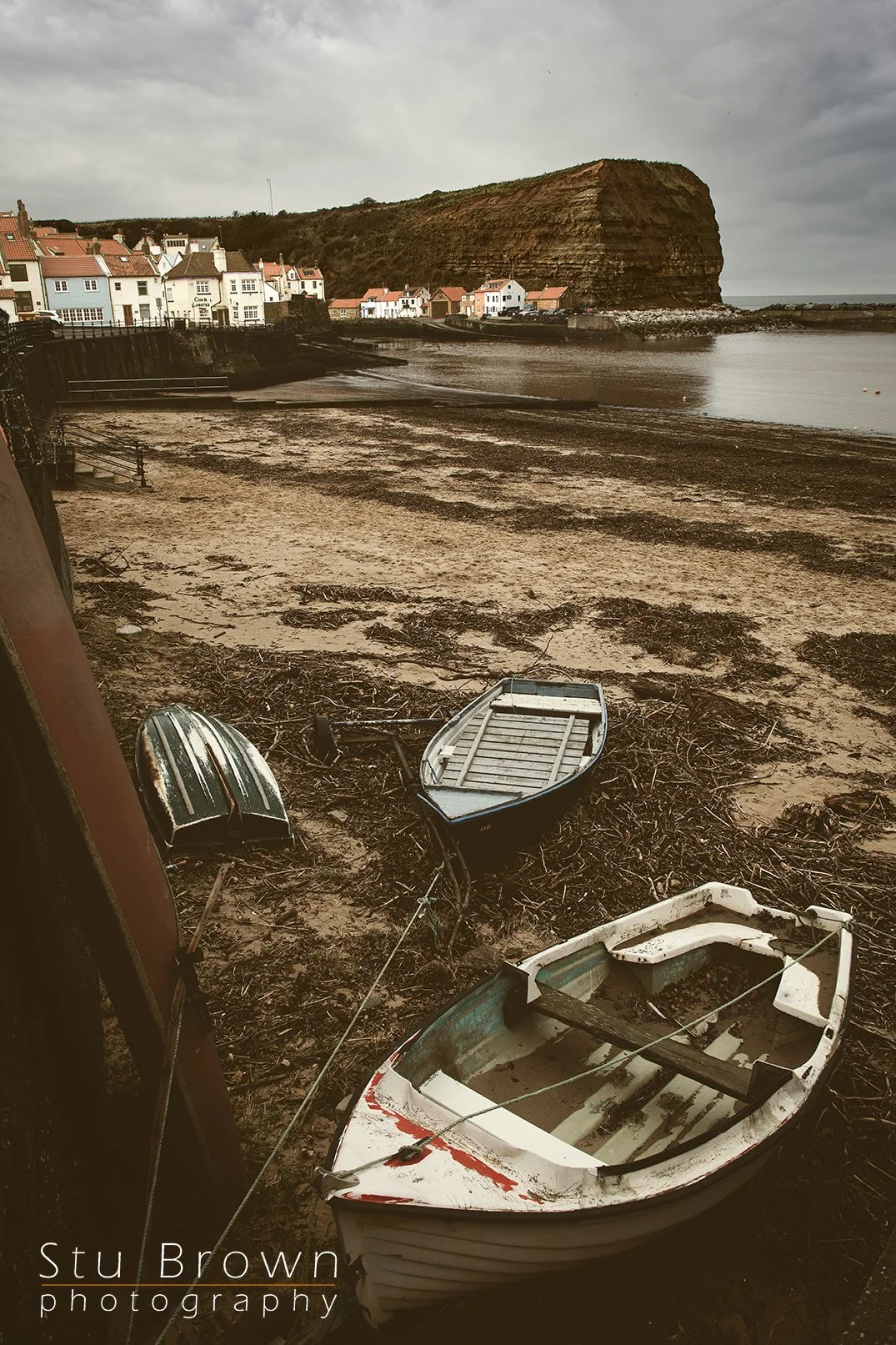 I took this photograph today while wandering through Staithes harbour, camera in hand, with the sky heavy above and the tide pulled far back. The boats sat quietly on the sand, weathered and resting, as if waiting patiently for the sea to return. There was no rush, no noise — just the sound of distant water and the creak of ropes in the breeze.